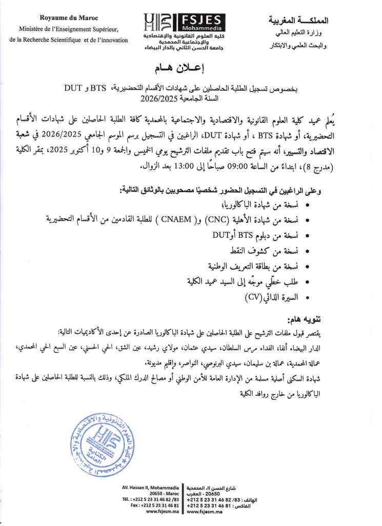 اعلان هام بخصوص تسجيل الطلبة الحاصلين على شهادات الاقسام التحضيرية BTS و DUT